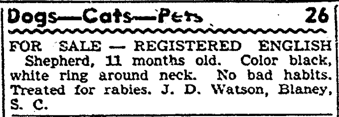 FOR SALE – REGISTERED ENGLISH Shepherd, 11 months old. Color black, white ring around neck. No bad habits. Treated for rabies. J. D. Watson, Blaney, S. C.
