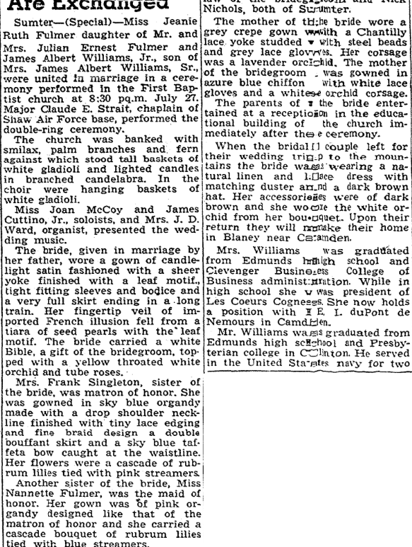 By UNITED PRESS At least seven persons met violent death in South Carolina over the weekend, five of them from highway accidents, a united Press survey shows today. Charles. S. Terry, 23, was fatally injured about 12:10 a.m. today when the car he was driving struck the rear of a Navy shore patrol wagon near Charleston. Ernest Leo Ward, 15 died yesterday morning from injuries … Continue reading Violent Death Comes To 7 In SC Weekend