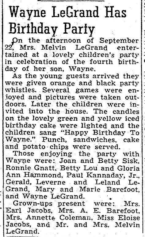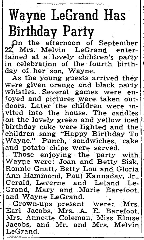 On the afternoon of September 22, Mrs. Melvin LeGrand entertained at a lovely children’s party in celebration of the fourth birthday of her son, Wayne.