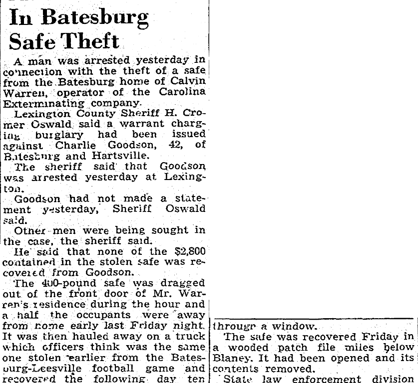 The 400-pound safe was dragged out of the front door of Mr. Warren’s residence during the hour and a half the occupants were away from home early last Friday night. It was then hauled away on a truck which officers think was the same one stolen earlier from the Batesburg-Leesville football game and recovered the following day ten miles from Batesburg. Entrance to Mr. Warren’s house was made through a window.