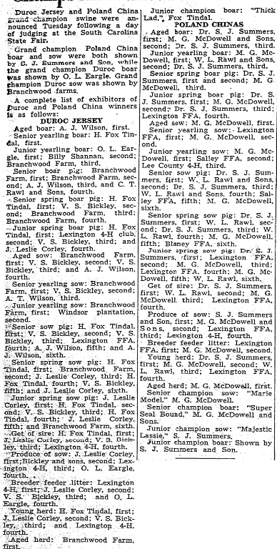 Senior sow pig: First and third prize Dr. D. S. Summers and son, Cameron; second and fourth prizes, W. T. Rawl and sons, Lexington; fifth prize, Salley FFA; sixth prize, M. G. McDowell and sons, Elliott.
