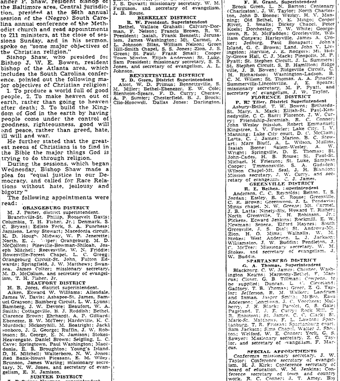 Branchville- St. Phillip, Roosevelt Davis; Columbia, T. H. Fisher, Jr.; Denmark, S. C. Bryant; Edisto Fork, S. A. Funchess; Jamison, Leroy Stewart; Macedonia circuit, K. D. Hough, Midway, W. P. Jenerette; North, E. J. Hooper; Orangeburg, M. D. McCollom; Pineville-Bowman-Shiloah, Joseph Mitchell; Reevesville, W. N. Friddie; Rowesville-Forest Chapel, L. C. Gregg; Orangeburg Circuit- St. John, Fulton Edwards; Springfield, J. W. Matthews; Swansea, James Colter; missionary secretary, M. D. McCollum, and secretary of evangelism, T. H. Fisher, Jr.