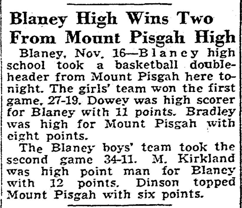 Blaney, Nov. 16 – Blaney high school took a basketball double-header from Mount Pisgah here tonight. The girls’ team won the first game, 27-19. Dowey was high scorer for Blaney with 11 points. Bradley was high for Mount Pisgah with eight points.