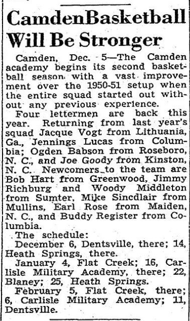Camden, Dec. 5 – The Camden academy begins its second basketball season with a vast improvement over the 1950-51 setup when the entire squad started out with out any previous experience.