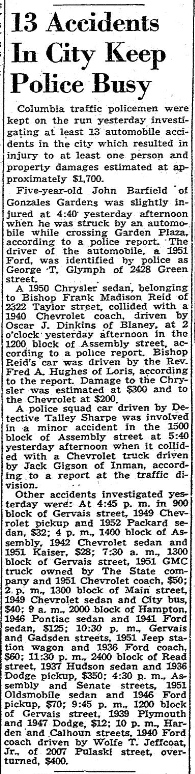 Other accidents investigated yesterday were: At 4:45 p.m. in 900 block of Gervais street, 1949 Chevrolet pickup and 1952 Packard sedan, $32; 4 p.m., 1400 back of Assembly, 1942 Chevrolet sedan and 1951 Kaiser, $28; 7:30 a.m., 1300 block of Gervais street, 1951 GMC truck owned by The State company and 1951 Chevrolet coach, $50; 2 p.m., 1300 block of Hampton, 1946 Pontiac sedan and 1941 Ford sedan, $125; 10:30 p.m., Gervais and Gadsden streets, 1951 Jeep station wagon and 1936 Ford coach, $60; 11:30 p.m., 2400 block of Read street, 1937 Hudson sedan and 1936 Dodge pickup, $350; 4:30 p.m., Assembly and Senate streets, 1951 Oldsmobile sedan and 1946 Ford pickup, $70; 9:45 p.m., 1200 black of Gervais street, 1939 Plymouth and 1947 Dodge, $12; 10 p.m., Harden and Calhoun streets, 1940 Ford coach drive by Wolfe T. Jeffcoat, Jr. of 2007 Pulaski street, overturned, $400.