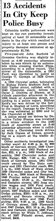 Other accidents investigated yesterday were: At 4:45 p.m. in 900 block of Gervais street, 1949 Chevrolet pickup and 1952 Packard sedan, $32; 4 p.m., 1400 back of Assembly, 1942 Chevrolet sedan and 1951 Kaiser, $28; 7:30 a.m., 1300 block of Gervais street, 1951 GMC truck owned by The State company and 1951 Chevrolet coach, $50; 2 p.m., 1300 block of Hampton, 1946 Pontiac sedan and 1941 Ford sedan, $125; 10:30 p.m., Gervais and Gadsden streets, 1951 Jeep station wagon and 1936 Ford coach, $60; 11:30 p.m., 2400 block of Read street, 1937 Hudson sedan and 1936 Dodge pickup, $350; 4:30 p.m., Assembly and Senate streets, 1951 Oldsmobile sedan and 1946 Ford pickup, $70; 9:45 p.m., 1200 black of Gervais street, 1939 Plymouth and 1947 Dodge, $12; 10 p.m., Harden and Calhoun streets, 1940 Ford coach drive by Wolfe T. Jeffcoat, Jr. of 2007 Pulaski street, overturned, $400.
