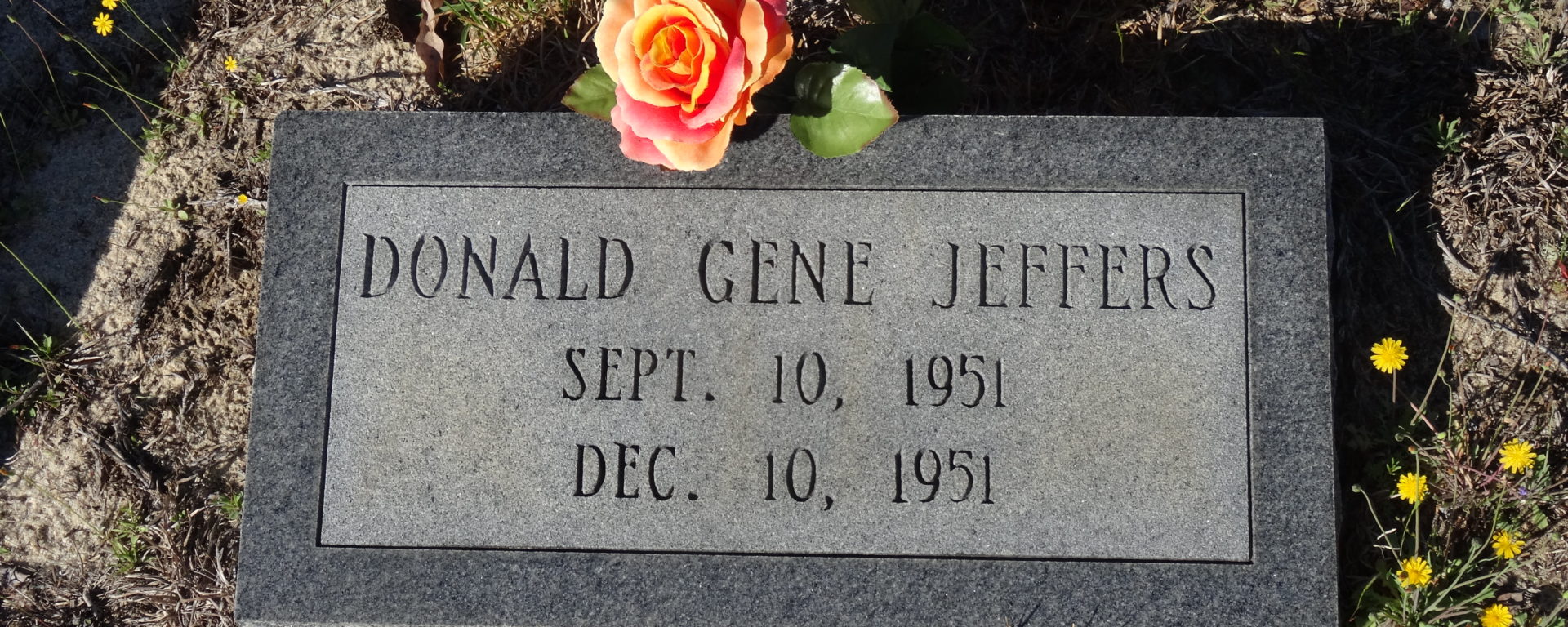 He died on 10 Dec 1951 in Columbia, Richland, South Carolina, USA at Columbia Hospital. Donald Gene Jeffers was buried on 11 Dec 1951 in Elgin, Kershaw, South Carolina, USA at Highway Pentecostal Holiness Church Cemetery. His cause of death was hydrocephalus due to spina bifida.