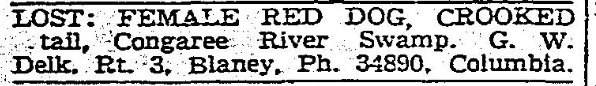 Today in HistoryLost and Found LOST: FEMALE RED DOG, CROOKED tail, Congaree River Swamp, G. W. Delk, Rt. 3, Blaney, Ph. 34890, Columbia. December 16, 1951 State (published as The State) Columbia, South CarolinaPage 74