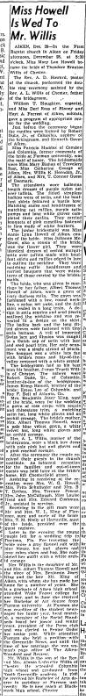 AIKEN, Dec. 29 – In the First Baptist church in Aiken on Friday afternoon, December 28, at 5:30 o’clock, Miss Mary Lou Howell became the bride of Theodore Braxton Willis of Chester.