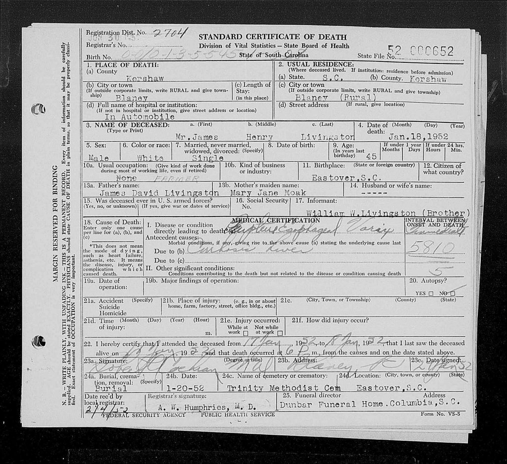 James Henry Livingston was born on 16 Jan 1907 in Eastover, Richland, South Carolina, USA a child of James David Livingston and Mary Jane Moak Livingston.