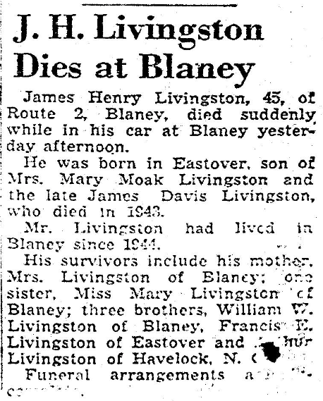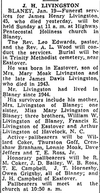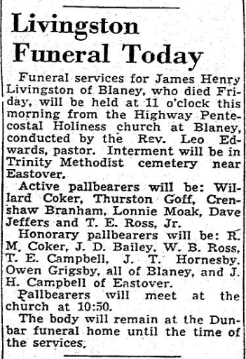 Funeral services for James Henry Livingston of Blaney, who died Friday, will be held at 11 o’clock this mornign from the Highway Pentecostal Holiness Church in Blaney, conducted by the Reverend Leo Edwards, pastor. Interment will be in Trinity Methodist cemetery, near Eastover.