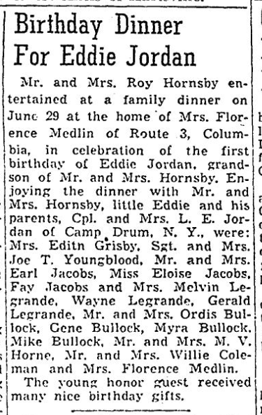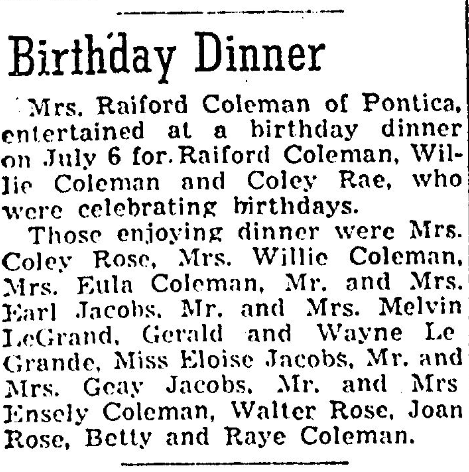 Mrs. Raiford Coleman of Pontiac, entertained at a birthday dinner on July 6 for Raiford Coleman, Willie Coleman and Coley Rae, who were celebrating birthdays. Those enjoying dinner were Mrs. Coley Rose, Mrs. Willie Coleman, Mrs. Eula Coleman, Mr. and Mrs. Earl Jacobs (Evetta Jacobs), Mr. and Mrs. Melvin LeGrand (Earline LeGrand), Gerald and Wayne LeGrande, Miss Eloise Jacobs, Mr. and Mrs. Geay Jacobs, Mr. … Continue reading Birthday Dinner