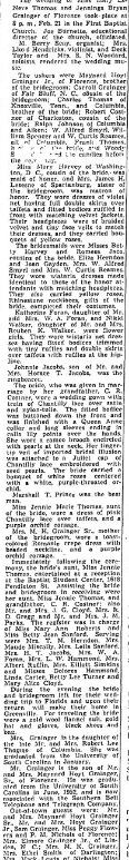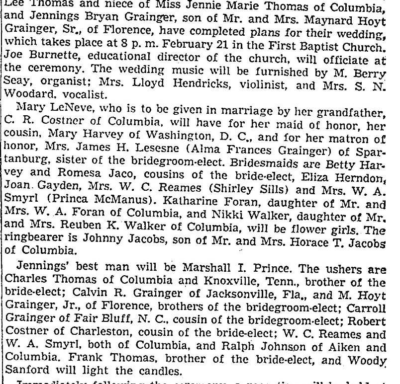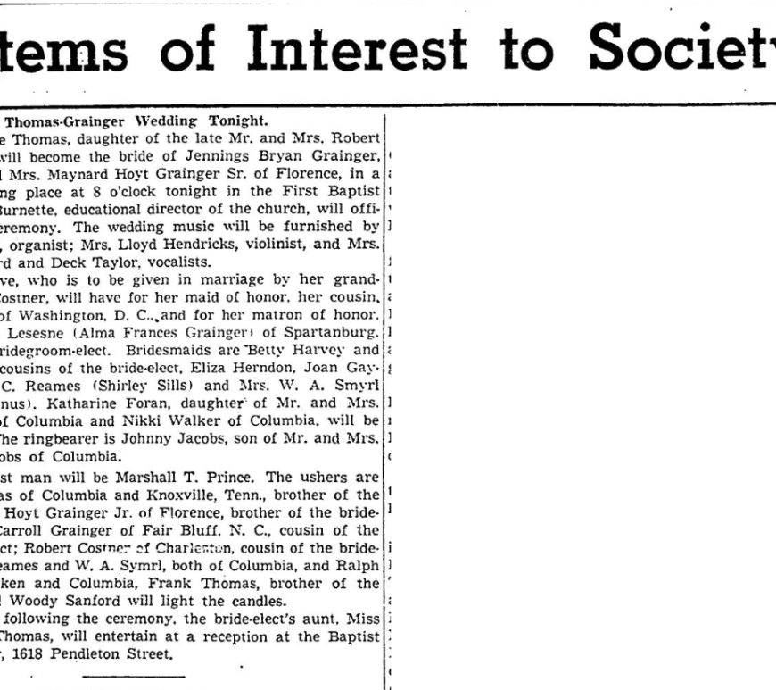 The wedding of Miss Mary LeNeve Thomas and Jennings Bryan Grainger of Florence took place at 8 p.m., Feb. 21 in the First Baptist Church. Joe Burnette, educational director of the church, officiated. M. Berry Seay, organist; Mrs. Lloyd Hendricks, violinist, and deck Taylor and Mrs. S. N. Woodard, soloists, rendered the wedding music. The ushers were Maynard Hoyt Grainger Jr., of Florence, brother of … Continue reading Thomas, Grainger Wedding