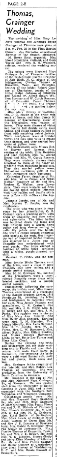 The wedding of Miss Mary LeNeve Thomas and Jennings Bryan Grainger of Florence took place at 8 p.m., Feb. 21 in the First Baptist Church. Joe Burnette, educational director of the church, officiated.