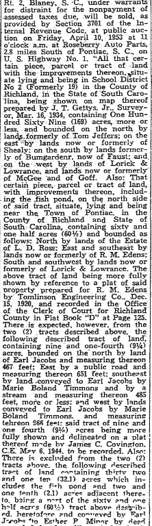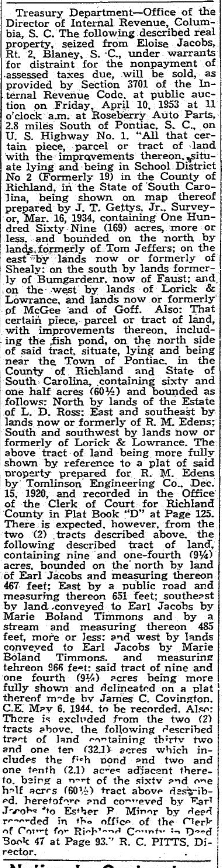 Treasury Department – Office of the Director of Internal Revenue, Columbia, S. C. The following described real property, seized from Eloise Jacobs, Rt. 2, Blaney, S. C., under warrants for distraint for the nonpayment of assessed taxes due, will be sold, as provided by section 3701 of the Internal Revenue Code, at public auction on Friday, April 10, 1953 at 11 o’clock a.m. at Roseberry Auto Parts, 2.8 miles South of Pontiac, S. C., on U. S. Highway No. 1. “All that certain piece parcel or tract of land with the improvements thereon, situates lying and being in School District No. 2 (Formerly 19) in the State of South Carolina, being shown on map thereof prepared by J. T. Gettys, Jr., Surveyor, Mar. 16, 1934, containing One Hundred Sixty-Nine (169) acres, more or less, and bounded on the North by lands formerly of Tom Jeffers, on the East by lands now or formerly of Shealy, on the South by lands formerly of Bumgardner, now of Faust, and on the West by lands of Lorick & Lowrance, and lands now of formerly of McGee and of Goff. Also: that certain piece, parcel or tract of land with improvements thereon, including the fish pond on the North side of said tract, situate lying and being near the Town of Pontiac in the County of Richland and State of South Carolina, Containing sixty and one-half (60 1/2) acres and bounded as follows: North by lands of Estate of L. D. Ross, East and Southeast by lands now or formerly of R. M. Edens, South and Southeast by lands now or formerly of Lorick & Lowrance. The above tract of land being more fully shown by reference to a Plat of said property, prepared for R. M. Edens by Tomlinson Engineering Co. Dec. 15, 1920, and recorded in the Office of the Clerk of Court for Richland County in Plat Book D at Page 125. There is excepted, however, from the two (2) tracts above described the following described tract of land, containing nine and one-fourth (9 1/4) acres, bounded on North by land of Earl Jacobs and measuring thereon 467 feet. Each by a public road and measuring thereon 651 feet; Southeast by land conveyed to Earl Jacobs by Marie Boland Timmons and by a stream and measuring thereon 130 feet, South by a pond hereinafter 485 feet more or less; and West by land of Earl Jacobs and measuring thereon 966 feet; Said tract of nine and one quarter (9 1/4) acres being more fully shown and delineated on a plat thereof made by James C. Covington. C. E. May 6, 1914, to be record. Also: There is excluded from teh two (2) tracts above, the following described tract of land containing thirty two and one ten (32.1) acres which includes the fish pon and two and one tenth (2.1) acres adjacent there to being a part of the sixty and one half acres (60 1/2) tract above described, heretofor and conveyed by Earl Jacobs to Ester B. Minor by deed recorded in teh office of the Clerk of Court for Richland County in Deed Book 47 at Page 93.” R. C. PITTS, Director.