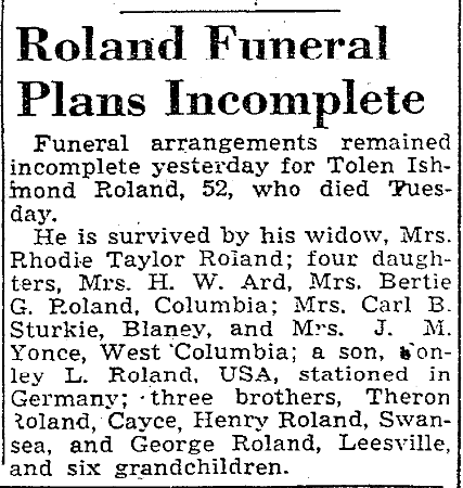 He was survived by his widow, Mrs. Rhodie Taylor Roland; four daughters, Mrs. H. W. Ard, Mrs. Bertie G. Roland, Columbia; Mrs. Carl B. Sturkie, Blaney, and Mrs. J. M. Yonce, West Columbia; a son, Conley L. Roland, USA, stationed in Germany; three brothers, Theron Roland, Cayce, Henry Roland, Swansea, and George Roland, Leesville, and six grandchildren.