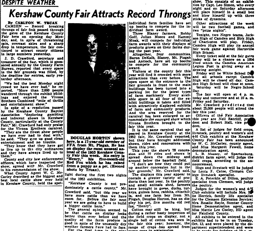 Douglas Horton shown here, is a 17-year-old member of FFA from Mt. Pisgah. He has on display the most unusual animal of the 1953 Kershaw County Fair this week. His entry is “Henry,” his five-month-old Red Fox which he has raised from a puppy as a pet. (Record photos by Truax).
