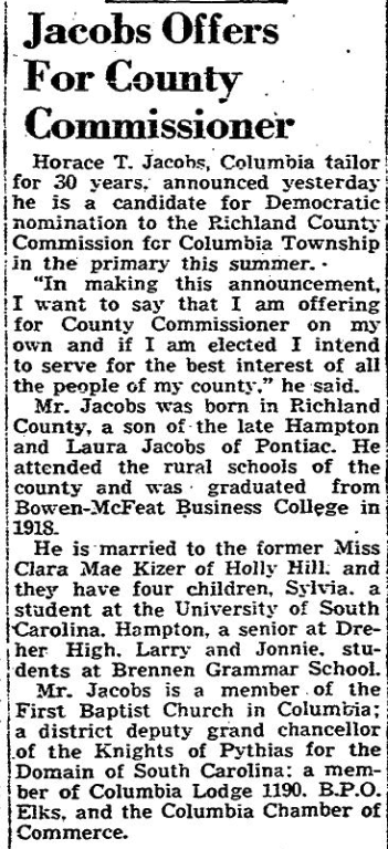 Horace T. Jacobs, Columbia tailor for 30 years, announced yesterday he is a candidate for Democratic nomination to the Richland County Commission for the Columbia Township in the primary this summer.