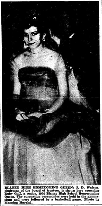 J. D. Watson, Chairman of the board of trustees, is shown here crowning Ruby Goff, a senior, 1954 Blaney High School Homecoming Queen. The coronation ceremonies were held in the gymnasium and were followed by a basketball game. (Photo by Manning Harris)