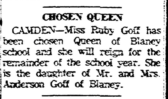 CAMDEN – Miss Ruby Goff has been Queen of Blaney school and she will reign for the remainder of the school year. She is the daughter of Mr. and Mrs. Anderson Goff of Blaney.