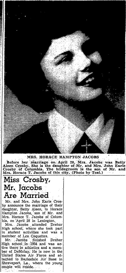 Mr. and Mrs. John Earle Crosby announce the marriage of their daughter, Betty Aleen, to Horace Hampton Jacobs, son of Mr. and Mrs. Horace T. Jacobs of Columbia, on April 28, in Lexington.
