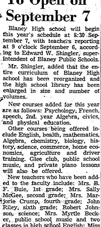 Blaney High school will begin this year’s schedule at 8:30 September 7, with teachers reporting at 9 o’clock September 6, according to Edward W. Shingler, superintendent of Blaney Public Schools.