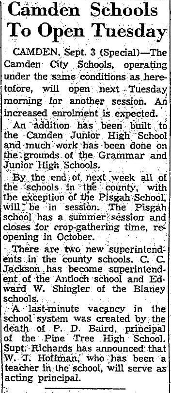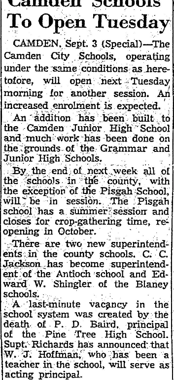CAMDEN, Sept. 3 (Special) – The Camden City Schools, operating under the same conditions as heretofore, will open next Tuesday morning for another session. An increased enrollment is expected.