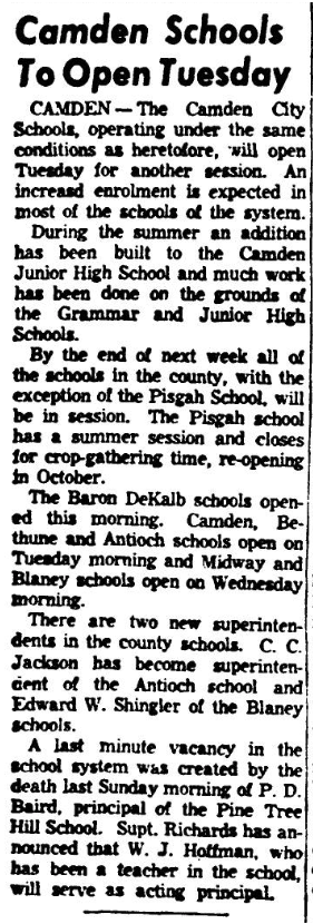 A last-minute vacancy in the school system was created by the death of P. D. Baird, principal of the Pine Tree High School. Supt. Richards has announced that W. J. Hoffman, who has been a teacher in the school, will serve as acting principal.