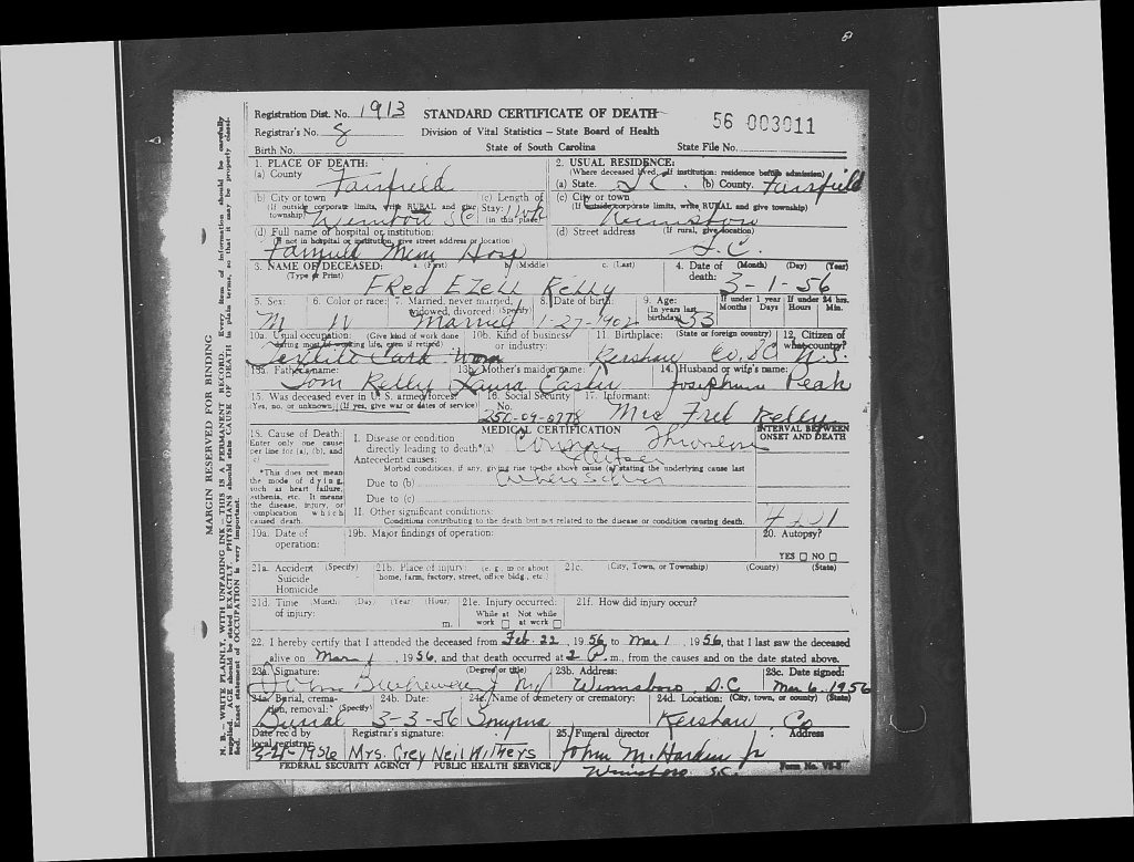 Fred Ezell Kelly was born on 27 Jun 1902 in Elgin, Kershaw, South Carolina, USA a child of Thomas Kelly and Laura Easler Kelly.