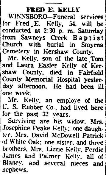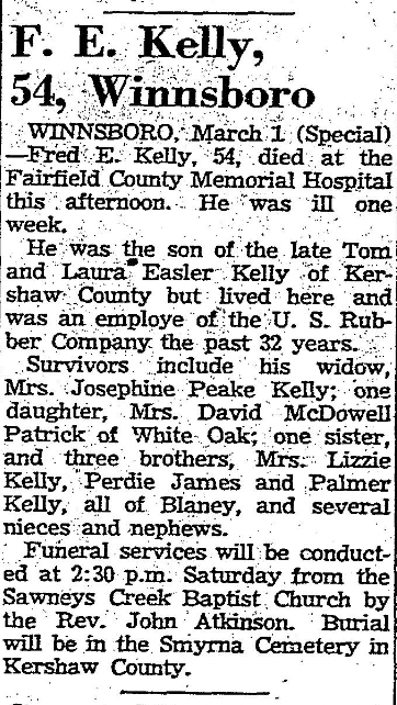 WINNSBORO, March 1 (Special) – Fred E. Kelly, 54, died at the Fairfield County Memorial this afternoon. He was ill one week.