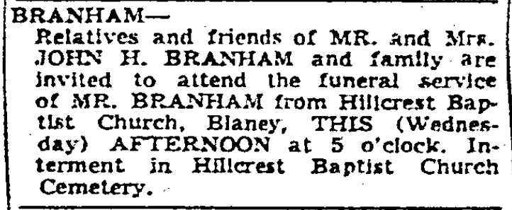John Hubert Branham 63, of Elgin, died suddenly of a heart attack at 3:45 p.m., on August 6, 1956, while at work.