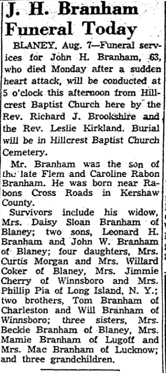 Survivors were his wife, Mrs. Daisy Sloan Branham of Blaney; two sons, Leonard H Branham and John W. Branham of Blaney; four daughters; Mrs. Curtis Morgan, and Mrs. Willard Coker of Blaney, Mrs. Jimmie Cherry of Winnsboro, and Mrs. Phillip Pia of Long Island, N. Y.; two brothers, Tom Branham of Charleston and Will Branham of Winnsboro; three sisters, Mrs. Beckie Branham of Blaney, Mrs. Mamie Branham of Lugoff and Mrs. Mac Branham of Lucknow, and three grandchildren.