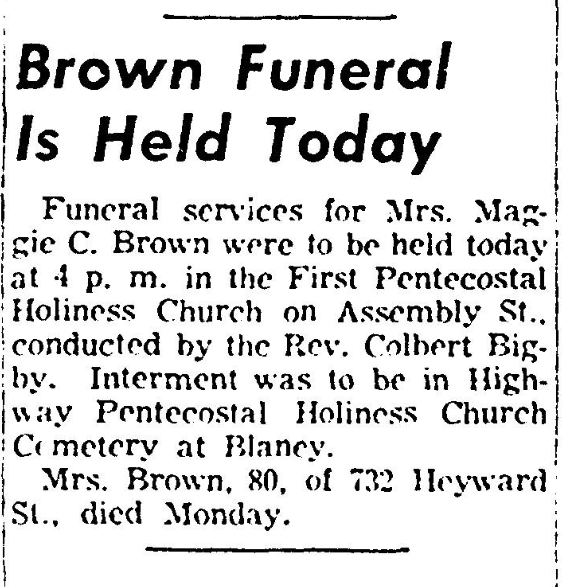 Funeral services for Mrs. Maggie C. Brown were to be held today at 4 p.m. in the First Pentecostal Holiness Church on Assembly Street by the Rev. Colbert Bigby, pastor. Interment was to be in Highway Pentecostal Holiness Church cemetery in Blaney.