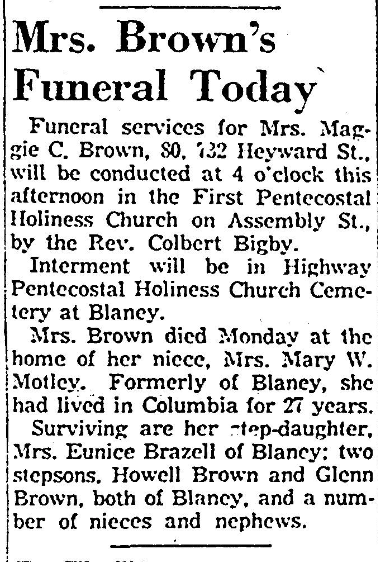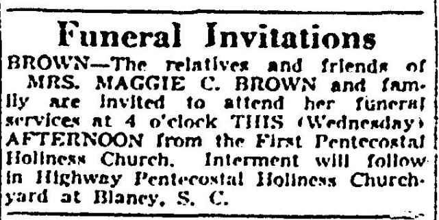 BROWN – The relatives and friends of MRS. MAGGIE C. BROWN and family are invited to attend her funeral services at 4 o’clock THIS (Wednesday) AFTERNOON from the First Pentecostal Holiness Church. Interment will follow in Highway Pentecostal Holiness Churchyard at Blaney, S. C.