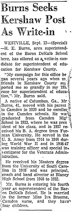 WESTVILLE, Sept. 12 – (Special) – H. E. Burns, area superintendent of the Baron DeKalb School here, has offered as a write-in candidate for superintendent of education for Kershaw County.