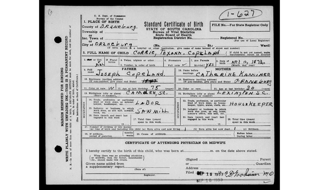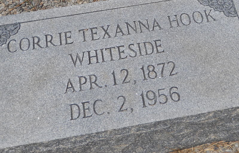 Corrie Texanna Copeland Hook Whiteside was born April 12, 1872, in Orangeburg, Orangeburg County, South Carolina, a daughter of Joseph Copeland and Catherine Kaminer.
