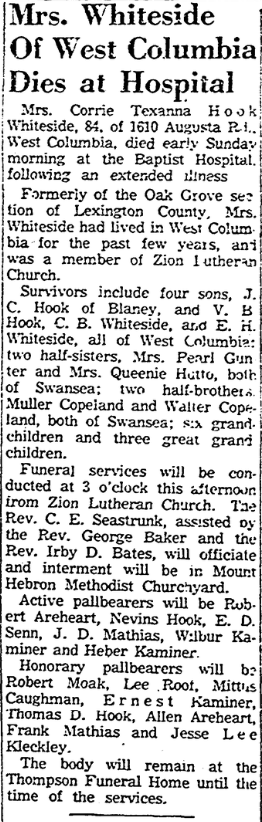 Surviving are four sons, J. C. Hook of Blaney, and V. B. Hook, C. B. Whiteside, and E. H. Whiteside, all of West Columbia; two half-sisters, Mrs. Pearl Gunter and Mrs. Queenie Hutto, both of Swansea; two half-brothers, Muller Copeland and Walter Copeland, both of Swansea; six grandchildren and three great-grandchildren.