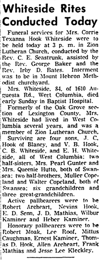 Funeral Services for Mrs. Corrie Texanna Hook Whiteside were to be held today, December 3, 1956 at 3 p.m., in Zion Lutheran Church, conducted by the Rev. C. E. Seastrunk, assisted by the Rev. George Baker and the Rev. Irby D. Bates. Interment was to be in Mount Hebron Methodist churchyard.