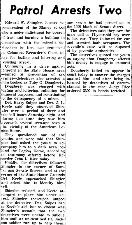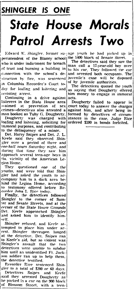Edward W. Shingler, former superintendent of the Blaney school who is under indictment for breach of trust and burning a building in connection with the schools destruction by fire, he was sentenced in a Columbia Recorder’s Court today for loafing and loitering and resisting arrest.