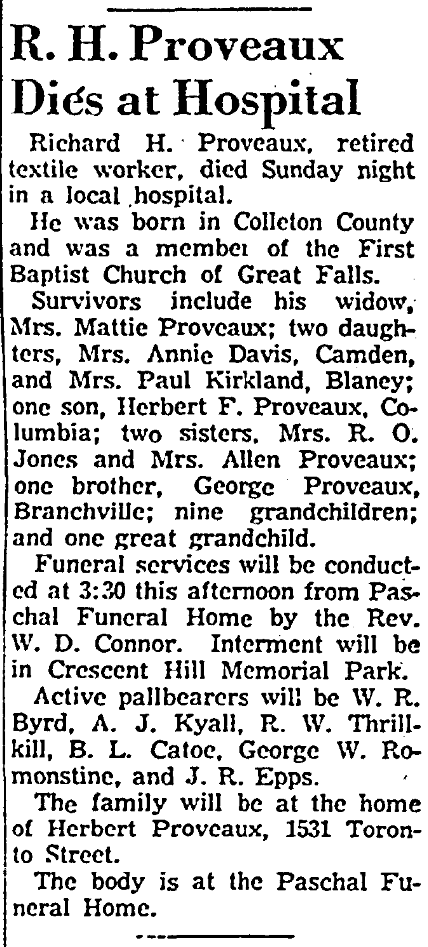 Survivors include his widow, Mrs. Mattie Proveaux; two daughters, Mrs. Annie Davis, Camden, and Mrs. Paul Kirkland, Blaney; one son, Herbert F. Proveaux, Columbia; two sisters, Mrs. R. O. Jones and Mrs. Allen Proveaux; one brother, George Proveaux, Brancheville; nine grandchildren; and one great grandchild.