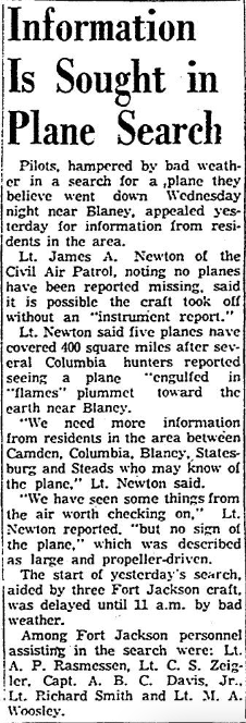 Among Fort Jackson personnel assisting in the search were: Lt. A. P. Rasmessen, Lt. C. S. Zeigler, Capt. A. B. C. Davis, Jr., Lt. Richard Smith and Lt. M. A. Woosley.