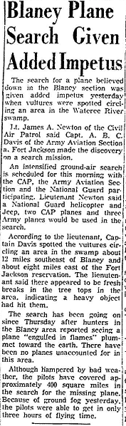 According to the lieutenant, Captain Davis spotted the vultures circling an area in the swamp about 12 miles southeast of Blaney and about eight miles east of the Fort Jackson reservation. The lieutenant said there appeared to be fresh breaks in the tree tops in the area, indicating a heavy object had hit them.