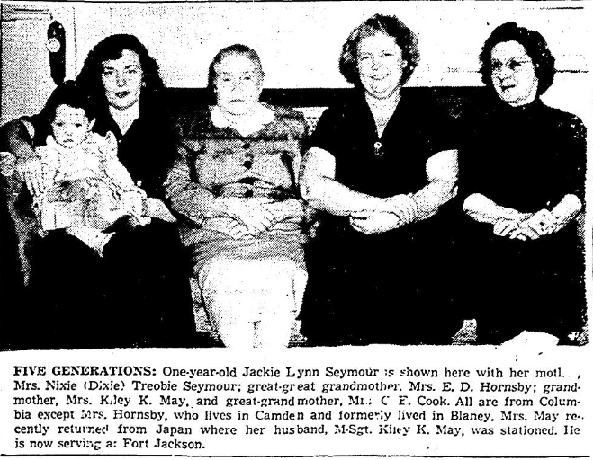 FIVE GENERATIONS: One-year-old Jackie Lynn Seymour is shown here with her mother, Mrs. Nixie (Dixie) Treobie Seymour; great-great-grandmother, Mrs. E. D. Hornsby; grandmother, Mrs. Kiley K. May, and great-grandmother, Mrs. C. E. Cook. All are from Columbia except Mrs. Hornsby, who lives in Camden and formerly lived in Blaney. Mrs. May recently returned from Japan where her husband, M-Sgt. Kiley K. May, was stationed. He is now serving at Fort Jackson.