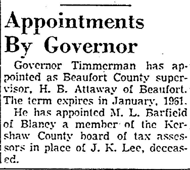 Governor Timmerman has appointed as Beaufort County supervisor, H. B. Attaway of Beaufort. The term expires in January, 1961.