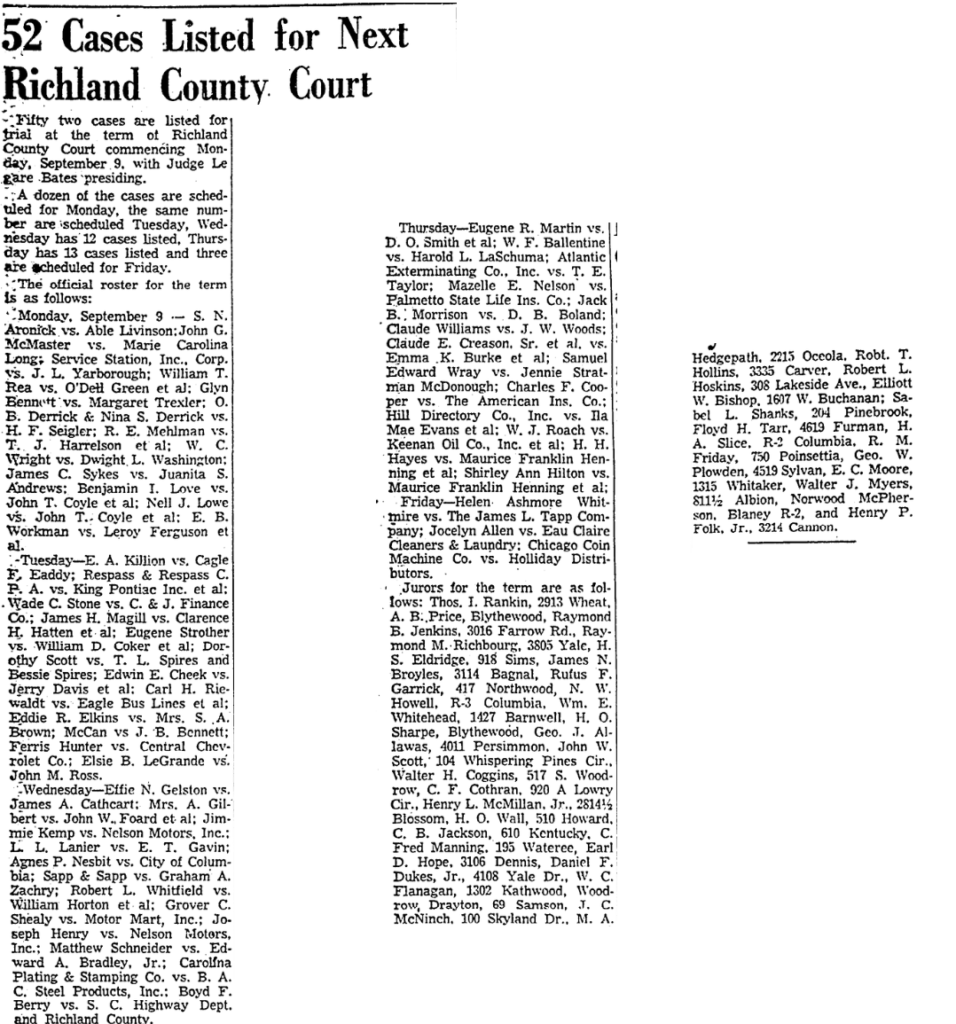 Jurors for the term are as follows; Thos. I Rankin, 2913 Wheat, A. B. Price, Blythewood, Raymond B. Jenkins, 3016 Farrow Rd., Raymond M. Richbourg, 3805 Yale, H. S. Eldridge, 918 Sims, James N. Broyles, 3114 Bagnal, Rufus F. Garrick, 417 Northwood, N. W. Howell, R-3 Columbia, Wm. E. Whitehead, 1427 Barnwell, H. O. Sharpe, Blythewood, Geo. J. Allawas, 4011 Persimmon, John W. Scott, 104 Whispering Pines Cir., Walter H. Coggins, 517 S. Woodrow, C. F. Cothran, 920 A Lowry Cir., Henry L. McMillan, Jr., 2814 1/2 Blossom, H. O. Wall, 510 Howard, C. B. Jackson, 610 Kentucky, C. Fred Manning, 195 Wateree, Earl D. Hope, 3106 Dennis, Daniel F. Dukes, Jr., 4108 Yale Dr., W. C. Flanagan, 1302 Kathwood, Woodrow, Drayton, 69 Samson, J. C. McNinch, 100 Skyland Dr., M. A. Hedgepath, 2215 Oceola, Robert T. Hollins, 3335 Carver, Robert L. Hoskins, 308 Lakeside Ave., Elliott W. Bishop, 1607 W. Buchanan; Sabel L. Shanks, 204 Pinebrook, Floyd H. Tarr, 4619 Furman, H. A. Slice, R-2 Columbia, R. M. Friday, 750 Poinsettia, Geo. W. Plowden, 4519 Sylvan, E. C. Moore, 1315 Whitaker, Walter J. Myers, 811 1/2 Albion, Norwood McPherson, Blaney R-2, and Henry P. Folk, Jr., 3214 Cannon.