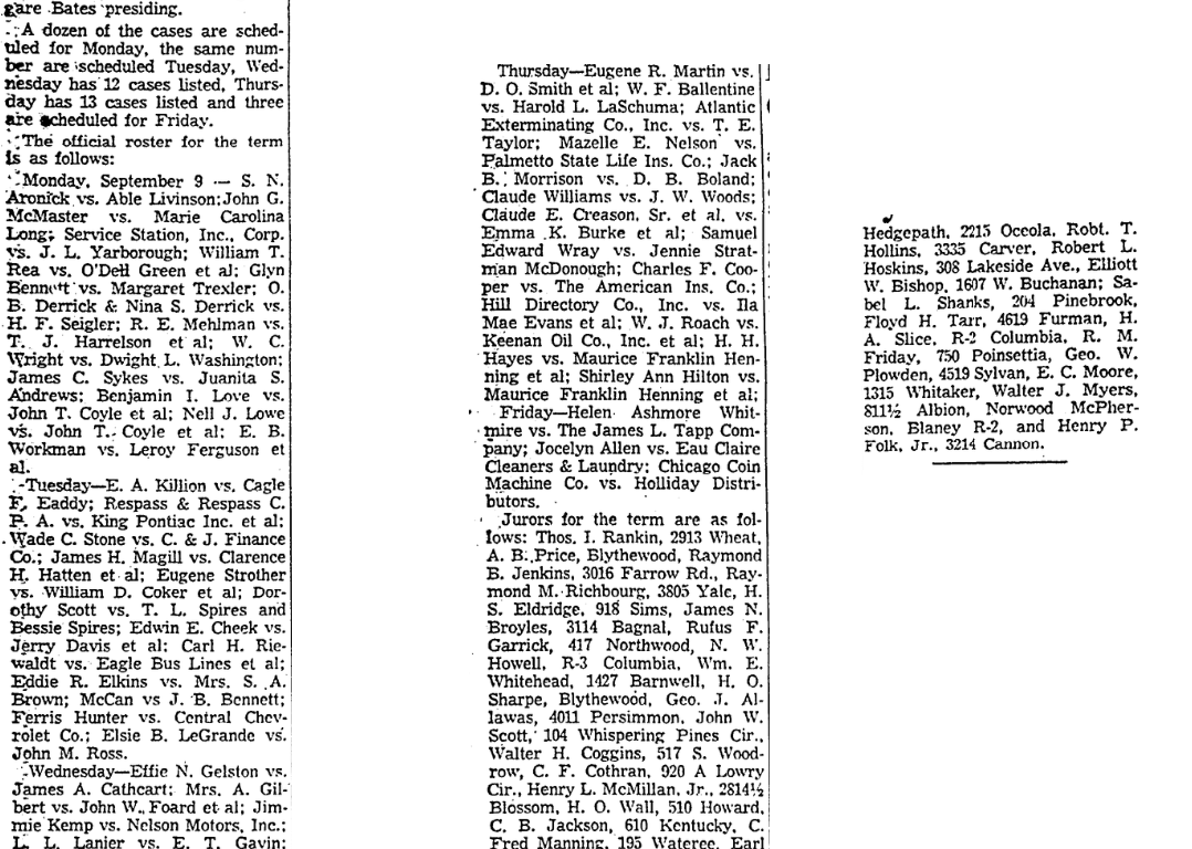 Jurors for the term are as follows; Thos. I Rankin, 2913 Wheat, A. B. Price, Blythewood, Raymond B. Jenkins, 3016 Farrow Rd., Raymond M. Richbourg, 3805 Yale, H. S. Eldridge, 918 Sims, James N. Broyles, 3114 Bagnal, Rufus F. Garrick, 417 Northwood, N. W. Howell, R-3 Columbia, Wm. E. Whitehead, 1427 Barnwell, H. O. Sharpe, Blythewood, Geo. J. Allawas, 4011 Persimmon, John W. Scott, 104 Whispering Pines Cir., Walter H. Coggins, 517 S. Woodrow, C. F. Cothran, 920 A Lowry Cir., Henry L. McMillan, Jr., 2814 1/2 Blossom, H. O. Wall, 510 Howard, C. B. Jackson, 610 Kentucky, C. Fred Manning, 195 Wateree, Earl D. Hope, 3106 Dennis, Daniel F. Dukes, Jr., 4108 Yale Dr., W. C. Flanagan, 1302 Kathwood, Woodrow, Drayton, 69 Samson, J. C. McNinch, 100 Skyland Dr., M. A. Hedgepath, 2215 Oceola, Robert T. Hollins, 3335 Carver, Robert L. Hoskins, 308 Lakeside Ave., Elliott W. Bishop, 1607 W. Buchanan; Sabel L. Shanks, 204 Pinebrook, Floyd H. Tarr, 4619 Furman, H. A. Slice, R-2 Columbia, R. M. Friday, 750 Poinsettia, Geo. W. Plowden, 4519 Sylvan, E. C. Moore, 1315 Whitaker, Walter J. Myers, 811 1/2 Albion, Norwood McPherson, Blaney R-2, and Henry P. Folk, Jr., 3214 Cannon.