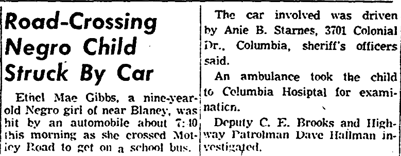 Ethel Mae Gibbs, a nine-year old Negro girl of near Blaney, was hit by an automobile about 7:40 this morning as she crossed Motley Road to get on a school bus.