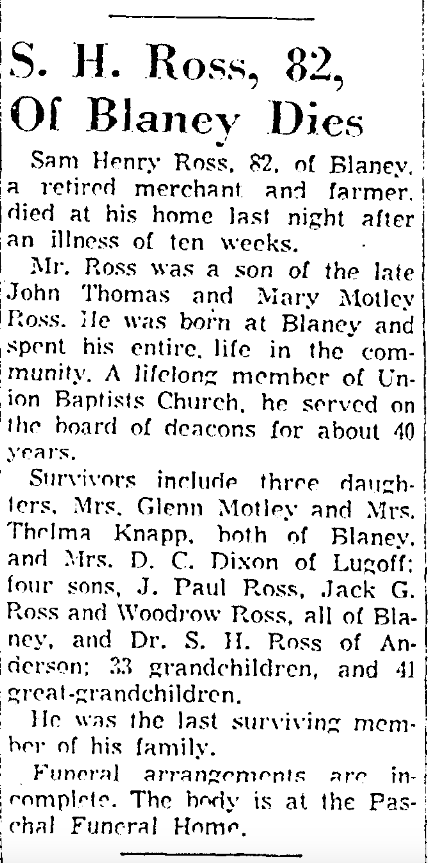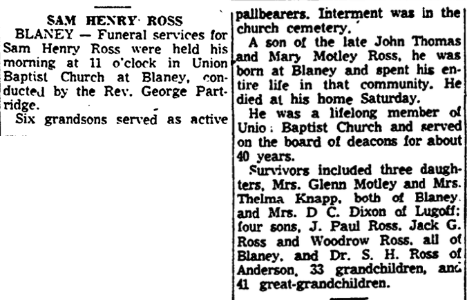 Survivors include three daughters, Mrs. Glenn Motley and Mrs. Thelma Knapp, both of Blaney, and Mrs. D. C. Dixon of Lugoff; four sons, J. Paul Ross, Jack G. Ross and Woodrow Ross, all of Blaney, and Dr. S. H. Ross of Anderson; 33 grandchildren, and 41 great-grandchildren.