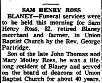 Sam Henry Ross, 82, of Blaney a retired merchant and farmer died at his home last night, September 28, 1957, after an illness of ten weeks.