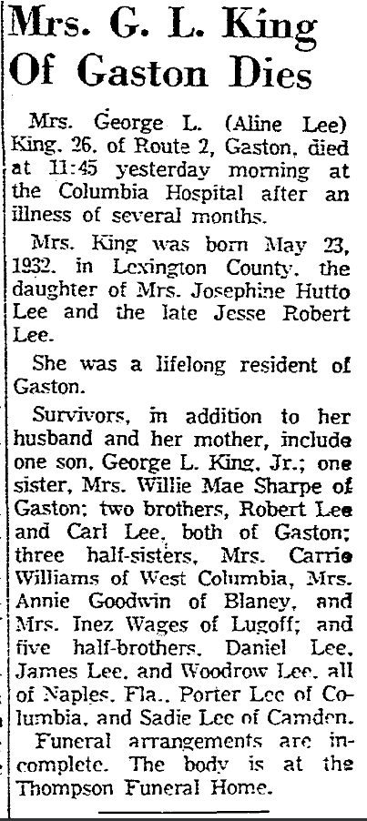 Mrs. George L. (Aline Lee) King, 26, of Route 2, Gaston, died at 11:45 yesterday morning, September 11, 1958 at the Columbia Hospital after an illness of several months.
